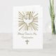 Um convite de confirmação com pomba em ouro e branco.