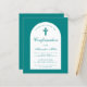Um convite de confirmação moderno para um menino. Em um fundo azul turquesa, há um arco branco com texto turquesa dentro. A ocasião e o nome são escritos em caligrafia elegante; a primeira linha é um texto curvo.
