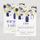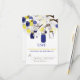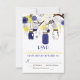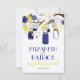 Ilustrações caprichosas de jarras mason azul marinho penduradas em uma árvore com cordas de coração, dois passarinhos e uma variedade de flores azuis e verdes. Este convite de casamento tem itens correspondentes. Este convite de jarra mason seria perfeito para casamentos de primavera, inverno e ao ar livre.