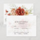 Um conjunto de convites de casamento elegante com flores em aquarela em tons rústicos de bege, laranja queimado e sienna em um fundo marrom.
