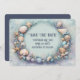 Salvar a Data. Uma bela coroa de conchas de praia cerca as informações para o seu cartão de salvar a data. Um cartão para amantes de costa, praia, litoral ou oceano.