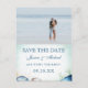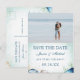 Convite de data de casamento moderno com caligrafia em aquarela com conchas, estrelas-do-mar, algas marinhas. Fundo de aquarela azul-teal. Combinação de fontes elegantes. Perfeito para casamento na praia ou com estilo náutico.