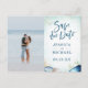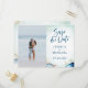 Salve o convite de data de casamento moderno com caligrafia em aquarela, apresentando conchas, estrelas-do-mar, algas. Fundo de aquarela azul-teal. Combinação de fontes elegantes. Perfeito para casamento na praia ou casamento com estilo náutico.