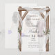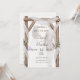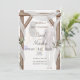 Um convite de casamento elegante com um arco de madeira rústica, cortinas brancas e um cabeçalho "Bismillah".