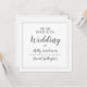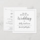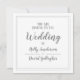 Um convite de design simples e limpo cinza e branco com texto claro e bordas quadradas. Texto branco sobre cinza na frente. Borda de linha fina no verso.