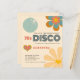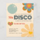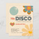 NOTA IMPORTANTE Existem duas opções de papel para escolher para este tamanho (4,5 x 5,6”) na faixa de preço econômica. Para este produto, eu recomendo fortemente o semi-brilho, que é um cartão de 110 gsm, semelhante em espessura a um cartão postal. A opção de cetim é um papel muito mais fino, 80 gsm. O padrão é definido como semi-brilho. Convite de despedida de solteira com tema Disco retrô dos anos 70 econômico. Estilo dos anos 70 com flores e bola de discoteca em Cores retrô.