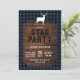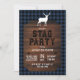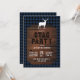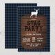 Convite de despedida de solteiro rústico com a silhueta branca de um cervo, xadrez azul de búfalo e textura de madeira. Convite de despedida de solteiro com xadrez azul de búfalo com fontes legais e textura de madeira impressa. Convite de despedida de solteiro com textura de madeira com um cervo branco e um fundo xadrez azul e preto.