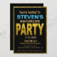 Convite de despedida de solteiro dourado. Este convite apresenta letras douradas com um "FESTA" em negrito com brilho e uma borda brilhante para adicionar diversão. Nota: Este é um design de arte gráfica de Amelia Carrie e não contém brilho confuso.