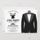 Surpreenda seus convidados com este convite de despedida de solteiro com smoking, apresentando tipografia moderna contra um fundo branco. Basta adicionar os detalhes do seu evento neste modelo fácil de usar para torná-lo um convite único. Vire o cartão para revelar um padrão de listras pretas e brancas no verso do cartão.