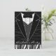 Convite de despedida de solteiro elegante, ou personalize para qualquer ocasião. Fundo listrado de zebra preto e branco com design de smoking e gravata borboleta clássicos. Design contemporâneo elegante é perfeito para uma última farra, última noite, las vegas ou noite de rapazes. Personalize online com os detalhes do seu evento.