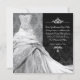O vestido de noiva real e o terno do Groom com tapete vermelho. Um profundo e rubi pico vermelho de bolso mostrando a data do casamento com noiva e nomes de noivos conectados a um nó de amor de diamante em um rico damasco preto com limite de sotaque de diamante.