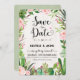 Convite de data de salva rústico com suculentas aquarela, rosas cor-de-rosa e letra caligráfica moderna.