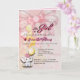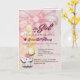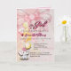 Um convite de chá de bebê dobrado com um fundo rosa suave, um laço decorativo e uma ilustração de elefante fofa com balões. O design combina elementos lúdicos com um layout suave e elegante. Totalmente personalizável com detalhes do evento, tornando-o perfeito para chás de bebê, celebrações e boas-vindas a uma nova menina.