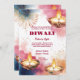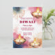 A frente do convite tem um fundo aquoso de cor macia com tons de azul e marrom em uma canvas branca. Ele apresenta detalhes de eventos escritos em um roteiro elegante e fluente, com lâmpadas Diya pintadas manualmente espalhadas pelo design. Padrões florais insípidos e decorações delicadas em azul e marrom acrescentam um toque festivo. O verso do cartão tem um tema de aquarela correspondente, com espaço para texto personalizado e desejos de Diwali, enquadrado por mais lâmpadas diya e elementos decorativos sutis. A estética geral é quente, convidativa e perfeita para o Festival das Luzes