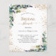 Bem-vindo a um Chá de panela elegante. Um fundo branco chic. Decorados com folhas de eucalipto, prigos, verde, folhas de ouro falso e pó de ouro, de cor aquosa verde. Personalize e adicione o nome da noiva a ser e os detalhes da parte. Letras pretas e ouros.