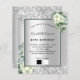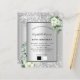 Fundo de aspecto fino prateado decorado com flores brancas, flores, verde eucalipto e brilho falso prateado, faíscas. Personalize e adicione seu nome, detalhes da festa e paleta de cores de traje. Letras negras. Clique em "editar design" para editar as cores, adicionar/excluir mais blocos de cores ou fazer com que a paleta seja menor se você tiver muito texto. Edite a cor da borda e a cor de preenchimento. 1 folha = 1 convite impresso de borda a borda