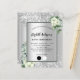 Fundo de aspecto fino prateado decorado com flores brancas, flores, verde eucalipto e brilho falso prateado, faíscas. Personalize e adicione seu nome, detalhes da festa e paleta de cores de traje. Letras negras. Clique em "editar design" para editar as cores, adicionar/excluir mais blocos de cores ou fazer com que a paleta seja menor se você tiver muito texto. Edite a cor da borda e a cor de preenchimento. 1 folha = 1 convite impresso de borda a borda