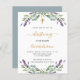 Um fundo branco decorado com flores lavandas e verde de eucalipto. Personalize e um nome e detalhes da cerimônia. Letras pretas e ouros coloridas.