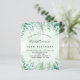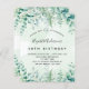 Um convite de tendência para um tema de 40ª (ou qualquer idade) festa de aniversário, encantado da floresta. Um fundo de cor aquosa verde com samambaias e eucalipto verde. O nome é escrito com um moderno estilo escrito à mão. Personalize e adicione os detalhes da sua festa.