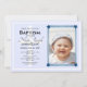 Um convite moderno para o batismo fotográfico que você pode personalizar e enviar para a celebração do seu evento batismo. Todos os textos são definidos usando a tipografia popular em preto. A cor do texto pode ser alterada usando a função EDIT. Foto de exemplo a ser substituída pela sua. Uma borda com padrão de estrelas complementa a parte traseira da carta em um fundo azul pastel.