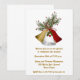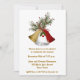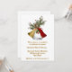 Convite para festas de férias com um sino branco, vermelho e dourado, ramificação de pínus e arco vermelho.