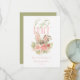 Bonita e elegante Páscoa e convite à caça aos ovos. A design apresenta orelhas bonitinhas com flores cor-de-rosa e folhas verdes. O fundo é branco. O verso é um verde limão sólido que combina com um pequeno buquê de ovos de Páscoa. Personalize-o para as suas necessidades.
