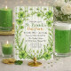 Um convite elegante com tema de trevo, emoldurado por folhagens verdejantes e sutis acentos listrados. Todo o texto é personalizável, e o padrão correspondente aparece no verso.