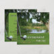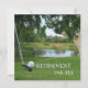 Convite de festa de aposentadoria com tema de golfe, apresentando uma imagem de um terreno de golfe.