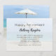 Convite de festa de aposentadoria com imagem de fundo de cadeiras de praia. Os modelos de texto simples têm a ocasião no topo, "Feliz Aposentadoria" com o nome do homenageado em seguida em letra cursiva. O restante do texto da festa é adicionado em forma de parágrafo, então use tanto texto quanto quiser. O verso é a mesma imagem de cadeiras de praia em cores vibrantes. Isso funciona para homens ou mulheres que planejam se aposentar em um estilo de vida à beira-mar.