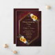 Um convite de festa de aquecimento com flores rústicas de borgonha com girassóis e rosas de cottage, apresentando o texto dentro de uma moldura geométrica dourada com um fundo de pedra rica em borgonha.