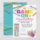 Nosso convite de festa de aniversário Game On Arcade Bowling original e mais vendido é o convite perfeito para qualquer festa com tema de jogos com arcade, laser tag ou boliche. Este design apresenta letras coloridas com gráficos divertidos de jogos de arcade, bola de boliche e pinos, e feixe de laser.