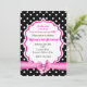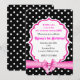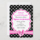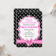 Convite de festa de bolinhas pretas e brancas com laço rosa. Personalize para qualquer evento.