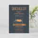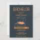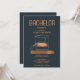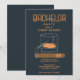 Convite de despedida de solteiro em um design laranja e azul marinho com charuto e copo de uísque. Personalize com os detalhes da sua festa.