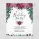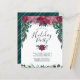 Este design rústico e boêmio apresenta um lindo buquê de aquarela em cascata de poinsettias vermelhas vintage borgonha e rosa dourado, juntamente com pequenas bagas e folhagem de inverno exuberante na parte frontal superior, incluindo folhagem de eucalipto e galhos de sempre-verde, em tons de verde-teal com detalhes sutis em dourado. Abaixo das poinsettias está o texto "Por favor, junte-se a nós para uma Festa de Natal" em tipografia serifada popular e caligrafia para um visual de letra manuscrita em verde-teal escuro, seguido por texto personalizável para os detalhes da festa e mais folhagem e bagas na parte inferior. A parte de trás do cartão apresenta um fundo verde-teal rico com listras diagonais em burgundy, rosa e branco para combinar com a frente. Você pode personalizar este item alter