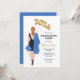 Festa de formatura Convidar retrato feminino desenhando vestido preto, boné e vestido azul, cabelo vermelho em um rabo de cavalo alto. Balões de ouro de 2024.