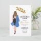Festa de formatura Convite para retrato feminino desenhando vestido preto, boné e vestido azul, cabelo castanho claro. Balões de ouro de 2024.