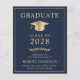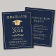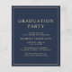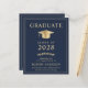 Elegante e acessível convite de formatura universitária azul e convite de festa com um chapéu de graduado dourado e tipografia dourada moderna para o nome do graduado, ano de turma, faculdade ou universidade, grau e especialização ou honrarias.