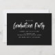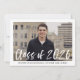 Convites de festa de formatura elegantes e modernos com a foto do formando emoldurada em branco com "Turma de 2026" em uma sobreposição de letra de pincel em aquarela branca. Personalize a frente adicionando o nome do formando e o nome da escola em texto preto. O convite se inverte para exibir os detalhes da sua festa de formatura em texto branco contra um fundo preto sólido.