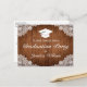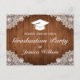Cartão de convite de festa de formatura. Estilo rústico com fundo de tábuas de madeira marrom e decoração de renda branca.