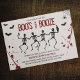 Organizando uma festa de halloween - confira este convite assustador com respingos de sangue, que apresenta esqueletos dançantes bêbados, uma teia de aranha e aranha, respingos de sangue vermelho e morcegos pretos. O título está em letra cursiva desgastada, mantendo o tema de halloween "boo's and booze" e um modelo moderno que é facilmente personalizável.