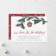 Convide amigos para celebrar em sua nova casa com nossos convites de festa de inauguração festivos e modernos. O design apresenta um ramo de pinheiro verde caçador adornado com um enfeite de bola vermelho e verde, e "nova casa para as festas" em letras de caligrafia vermelha. Adicione os detalhes da sua festa de inauguração em letras verde caçador.