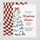Este convite de jantar de Natal apresenta xadrez vermelho de cranberry em negrito, uma árvore de Natal desenhada à mão e um lindo laço que une tudo. Com tipografia divertida e inspirada no vintage e uma paleta de cores preta, verde, vermelha e branca. Convide seus amigos e entes queridos para sua festa anual de jantar de Natal!