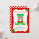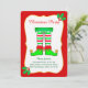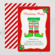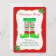 Convite de festa de Natal com leggings de elfo fofo em fundo vermelho. O texto está pronto para ser personalizado.