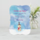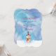 Convite de festa de Natal com ilustração de um boneco de neve fofo. Ele está usando um chapéu alto preto, segurando um cachimbo de espiga de milho clássico e usando um cachecol vermelho. De pé na neve branca fria sorrindo e acenando. O fundo é composto por um céu de aquarela azul e roxo com cores se misturando e se entrelaçando.