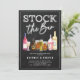 Convites de festa de noivado para casais com um fundo de quadro-negro, uma seleção de cervejas e vinhos em aquarela, o ditado "abasteça o bar", e um modelo de texto moderno que é fácil de personalizar.
