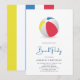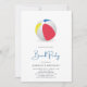 Convite de festa de praia com uma bola de praia colorida perfeita para festas de verão.