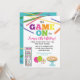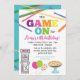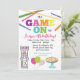 Nosso convite de festa de aniversário de pizza Game On Arcade original e mais vendido é o convite perfeito para qualquer festa temática de jogos com tema de arcade, laser tag ou pizza. Este design apresenta letras coloridas com gráficos divertidos de jogos de arcade, balões e pizza.