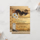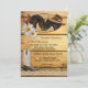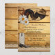 Um convite de festa de pós-casamento romântico com dois cavalos em um painel de madeira com ferraduras, renda e uma bota de cowboy. Ótimo para uma recepção apenas ou celebração após o casamento com tema western ou para amantes de cavalos.