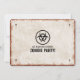 Convite com visual retrô para uma festa temática de surto de zumbis com uma placa desgastada e símbolos de risco biológico.