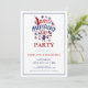 Convite de festa com símbolos do Dia da Independência e texto personalizado em vermelho e azul sobre um fundo branco. Comida, diversão e fogos de artifício.